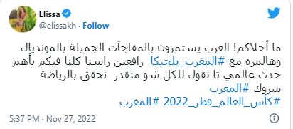 كما كتبت النجمة إليسا في تغريدة عبر تويتر: "ما أحلاكم! العرب يستمرون بالمفاجآت الجميلة بالمونديال وهالمرة مع المغرب رافعين راسنا كلنا فيكم بأهم حدث عالمي تا نقول للكل شو منقدر نحقق بالرياضة مبروك".
