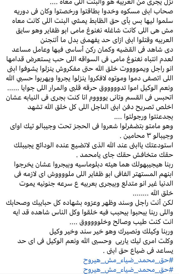 وتابعت والدة محمد ضياء "دموعى نزلت وبكيت اشوفوا مش هتستحملى قلتلهم انا امو فتحوا الباب ودخلت قفلت العربيه عليه وعليه وكشفت الغطا عن وشوا ...قلبى اندبح بسكينه وكأن حد ضربنى بجنزير حديد ع راسى وغصه فى الحنجره وبركان فى عيونى ..ابنى حبيبى اللى ضيعت عمرى عليه غرقان فى دموووو نزيف من الانف والراس والاذن وبرغم من كده مبتسم وبيضحك ..صرخت وقلتلوا ليه ليه يامحمد ياقلب أمك توجع قلبى ليه وفضلت ابوس فيه واحضنوا والدمووووع سيوووول من عيونى مغرقاه وفجأه سكت وفضلت اقووووول الحمد لله الحمد لله الحمد لله لا إله إلا الله يارب أنا راضيه وصابره والله راضيه يارب أنت هادتنى بيه يووووم ولادتوا وطلبتوا منى انهارده ميعزش عليك هيعز ع اللى خلقوا وبوستوا وغطيت وشوا ومسحت دموعى ونزلت .