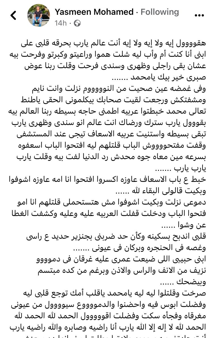 وكشفت والدته تفاصيل الواقعة فى رسالة مؤثرة قائلة،هقوووول إيه ولا إيه ولا إيه أنت عالم يارب بحرقه قلبى على ابنى أنا كنت أم وأب ليه شلت هموا وراعيتو وكبرتو وفرحت بيه عشان بقى راجلى وظهرى وسندى فرحت وقلت ربنا عوض صبرى خير بيك يامحمد ..وفى غمضه عين صحيت من النوووووم نزلت وانت نايم ومشفتكش ورجعت لقيت صحابك بيكلمونى الحقى ياطنط تعالى محمد خبطتوا عربيه اطمنى حاجه بسيطه ربنا العالم بيه بقووول يارب سترك ورضاك انت عالم انو سندى وظهرى يارب تبقى بسيطه واستنيت عربيه الاسعاف تيجى عند المستشفى وقفت مفتحووووش الباب قلتلهم ليه افتحوا الباب اسعفوه بسرعه مين معاه جوه محدش رد الدنيا لفت بيه وقلت يارب يارب يارب ..خبط ع باب الاسعاف عاوزه اكسروا افتحوا انا امه عاوزه اشوفوا وبكيت قالولى البقاء لله".