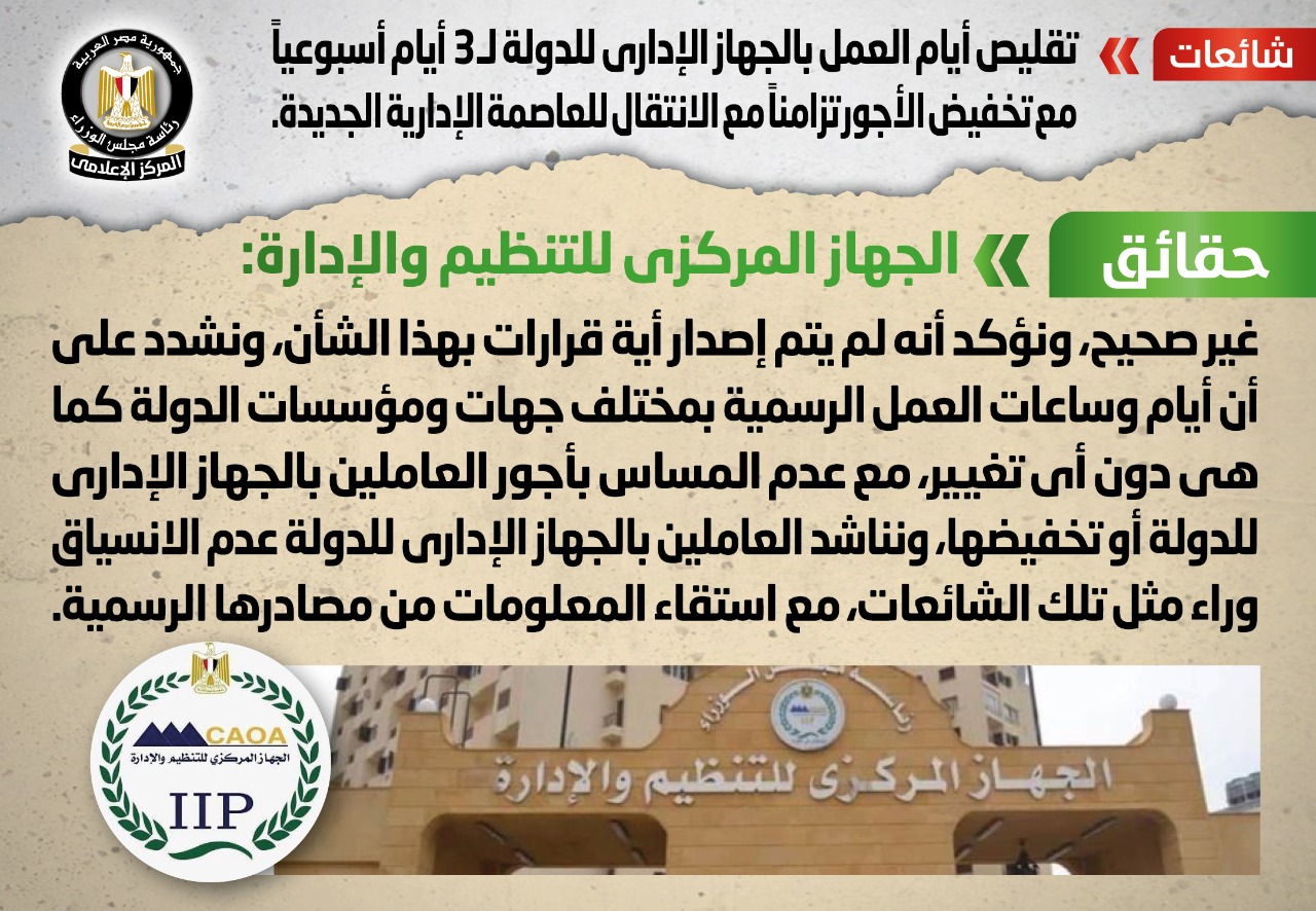 قام المركز الإعلامي لمجلس الوزراء بالتواصل مع الجهاز المركزي للتنظيم والإدارة، والذي نفى تلك الأنباء، مُؤكداً أنه لا صحة لتقليص أيام العمل بالجهاز الإداري للدولة لـ 3 أيام أسبوعياً أو تخفيض الأجور تزامناً مع الانتقال للعاصمة الإدارية الجديدة، وأنه لم يتم إصدار أية قرارات بهذا الشأن، مُشدداً على أن أيام وساعات العمل الرسمية بمختلف جهات ومؤسسات الدولة كما هي دون أي تغيير، مع عدم المساس بأجور العاملين بالجهاز الإداري للدولة أو تخفيضها، مُناشدةً العاملين بالجهاز الاداري للدولة عدم الانسياق وراء مثل تلك الشائعات، مع استقاء المعلومات من مصادرها الرسمية.