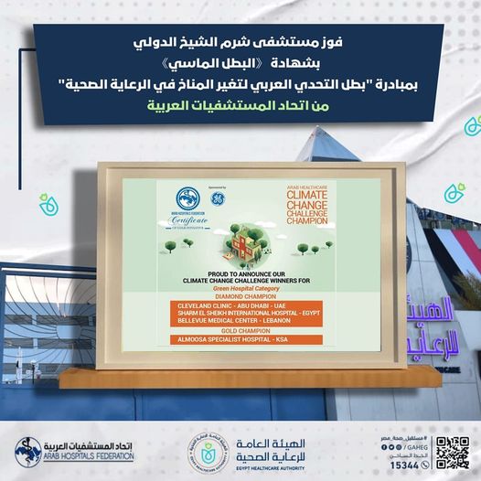 وثمَّن الدكتور أحمد السبكي، رئيس هيئة الرعاية الصحية، كافة الجهود المبذولة للوصول بمستشفى شرم الشيخ الدولي للفوز بشهادة البطل الماسي بمبادرة "بطل التحدي العربي لتغير المناخ في الرعاية الصحية" من إتحاد المستشفيات العربية، وذلك بعد حصولها أيضًا على شهادة الاعتراف الدولي من شبكة المستشفيات العالمية الخضراء GGHH، بما يعزز ريادتها في مجال الرعاية الصحية الخضراء عربيًا وعالميًا.
