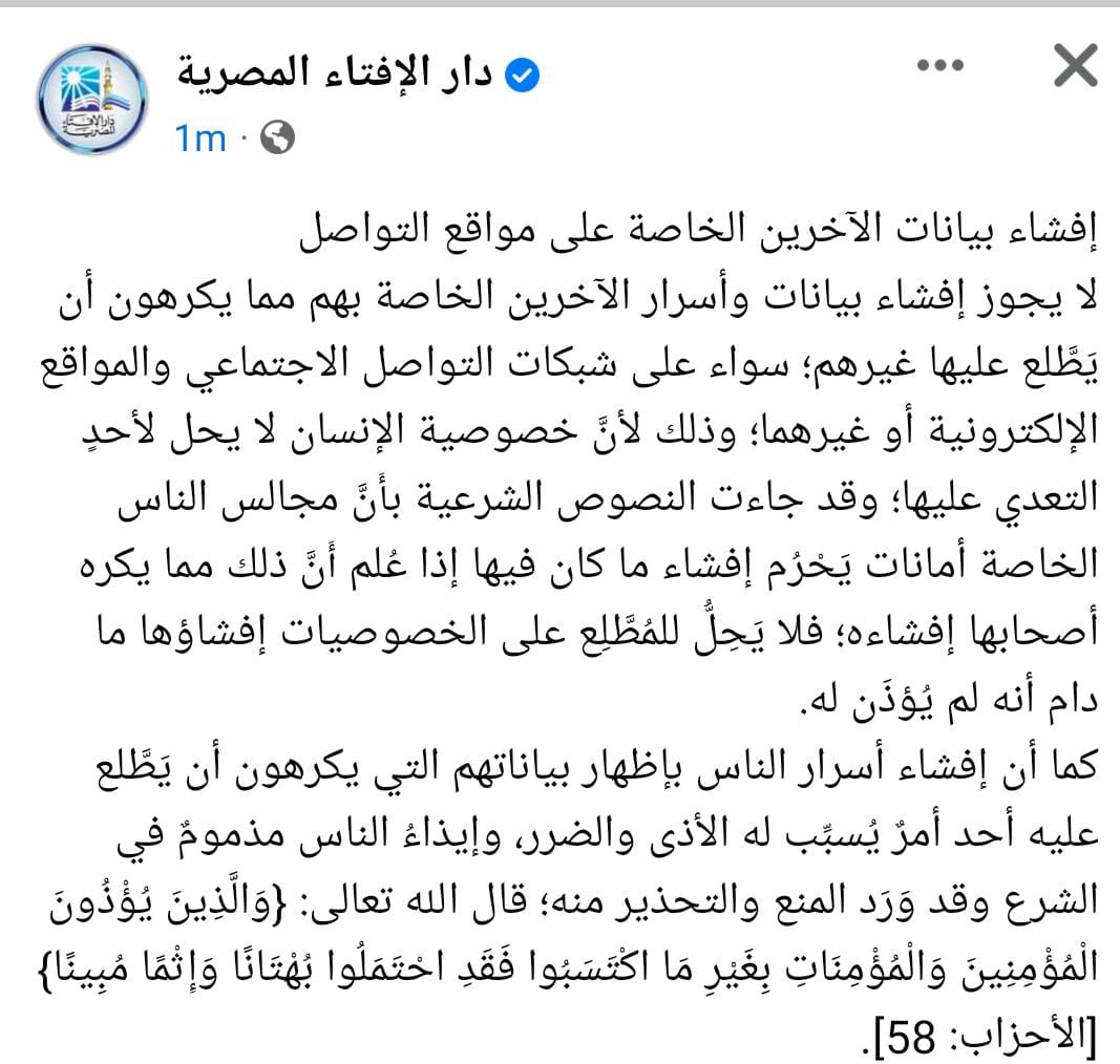 قالت دار الإفتاء في بيان لها منذ قليل ، إن إفشاء بيانات الآخرين الخاصة على مواقع التواصل:لا يجوز إفشاء بيانات وأسرار الآخرين الخاصة بهم مما يكرهون أن يَطَّلع عليها غيرهم؛ سواء على شبكات التواصل الاجتماعي والمواقع الإلكترونية أو غيرهما؛