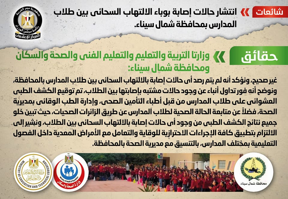 قام المركز الإعلامي لمجلس الوزراء بالتواصل مع وزارتي التربية والتعليم والتعليم الفني والصحة والسكان ومحافظة شمال سيناء، وقد تم نفي تلك الأنباء، وأكدوا أنه لا صحة لانتشار حالات إصابة بوباء الالتهاب السحائي بين طلاب المدارس بمحافظة شمال سيناء، وأنه لم يتم رصد أي حالات إصابة بالالتهاب السحائي بين طلاب المدارس بالمحافظة، وأوضحوا أنه فور تداول أنباء عن وجود حالات مشتبه بإصابتها بين الطلاب، تم توقيع الكشف الطبي العشوائي على طلاب المدارس من قبل أطباء التأمين الصحي، وإدارة الطب الوقائي بمديرية الصحة، فضلاً عن متابعة الحالة الصحية لطلاب المدارس عن طريق الزائرات الصحيات، حيث تبين خلو جميع نتائج الكشف الطبي من وجود أي حالات إصابة بالالتهاب السحائي بين الطلاب، وأشاروا إلى الالتزام بتطبيق كافة الإجراءات الاحترازية للوقاية والتعامل مع الأمراض المعدية داخل الفصول التعليمية بمختلف المدارس، بالتنسيق مع مديرية الصحة بالمحافظة.