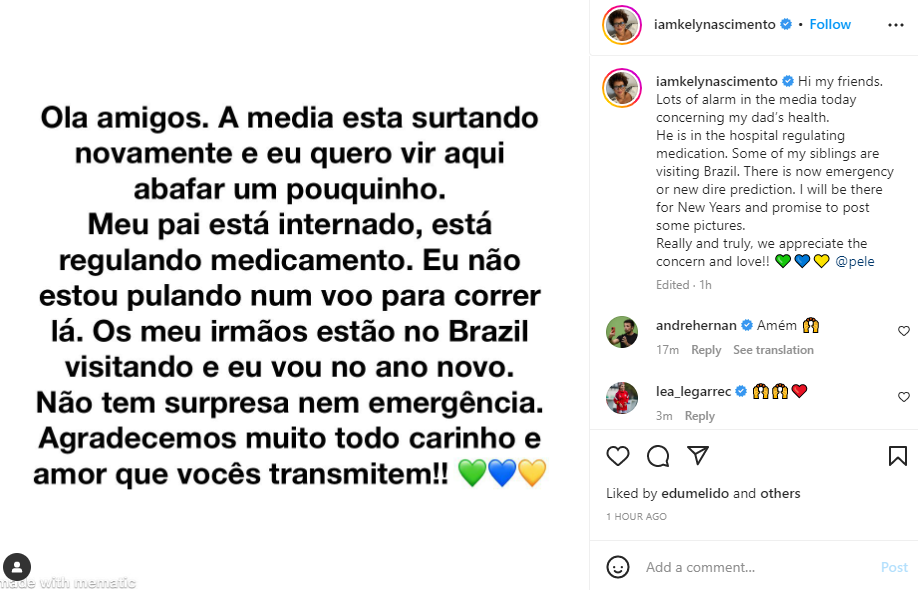 ونشرت أبنة بيليه عبر حسابها على "إنستجرام": إن أباها دخل المستشفى، لكنها أكدت أن حالته "ليست حرجة".