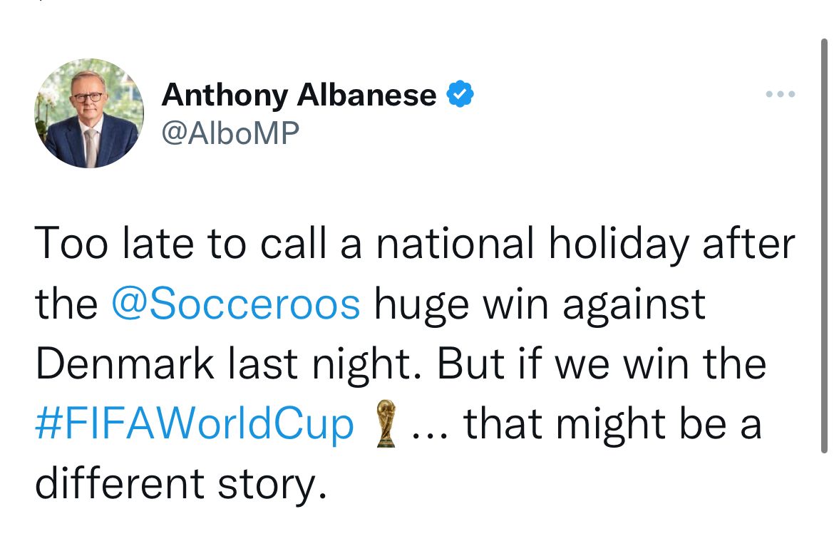 وقال أنتوني ألبانيز عبر صفحته الرسمية بموقع "تويتر"، "تأخرنا في منح عطلة بعد الفوز على الدنمارك لكن إذا فوزنا بكأس العالم… ستكون هذة قصة مختلفة".