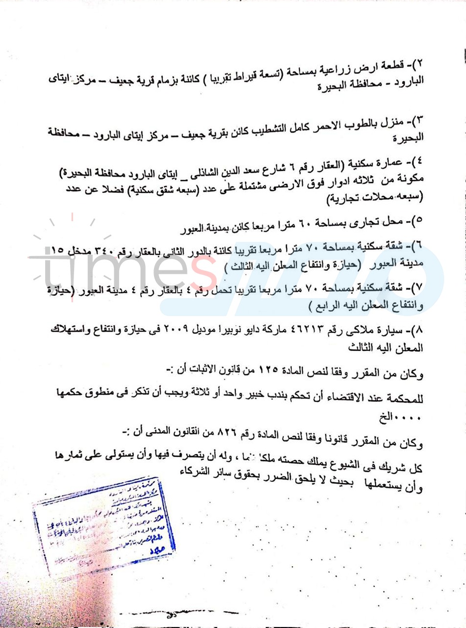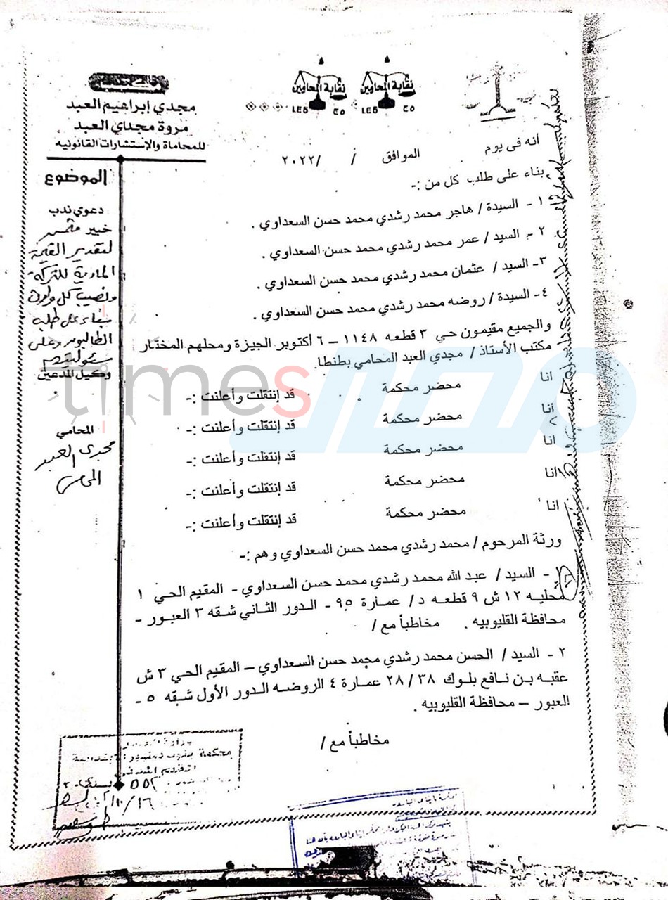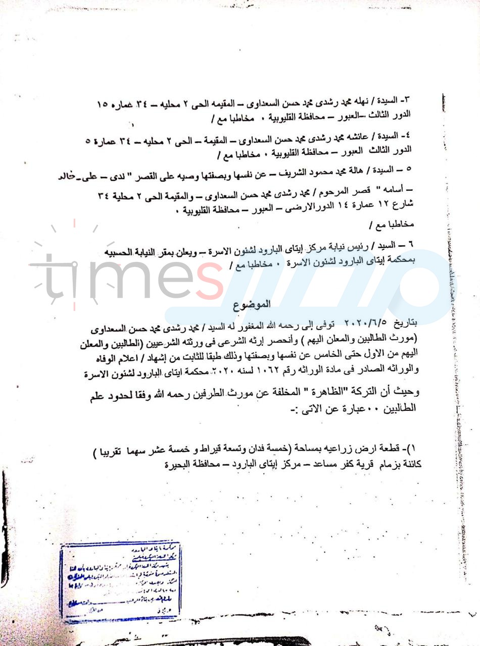 وقالت الدعوى أنه بتاريخ 2020/6/5 توفى محمد رشدی محمد حسن السعداوي "مورث الطالبين والمعلن اليهم" وانحصر إرثه الشرعي في ورثته الشرعيين الطالبين والمعلن اليهم من الأول حتى الخامس عن نفسها وبصفتها وذلك طبقا للثابت من إشهاد اعلام الوفاء والوراثه الصادر في مادة الوراثه رقم 1062 لسنه 2020 محكمة ايتاى البارود لشئون الأسرة وحيث أن التركة " الظاهرة " المخلفة عن مورث الطرفين رحمه الله وفقا لحدود علم الطالبين عبارة عن الآتى: