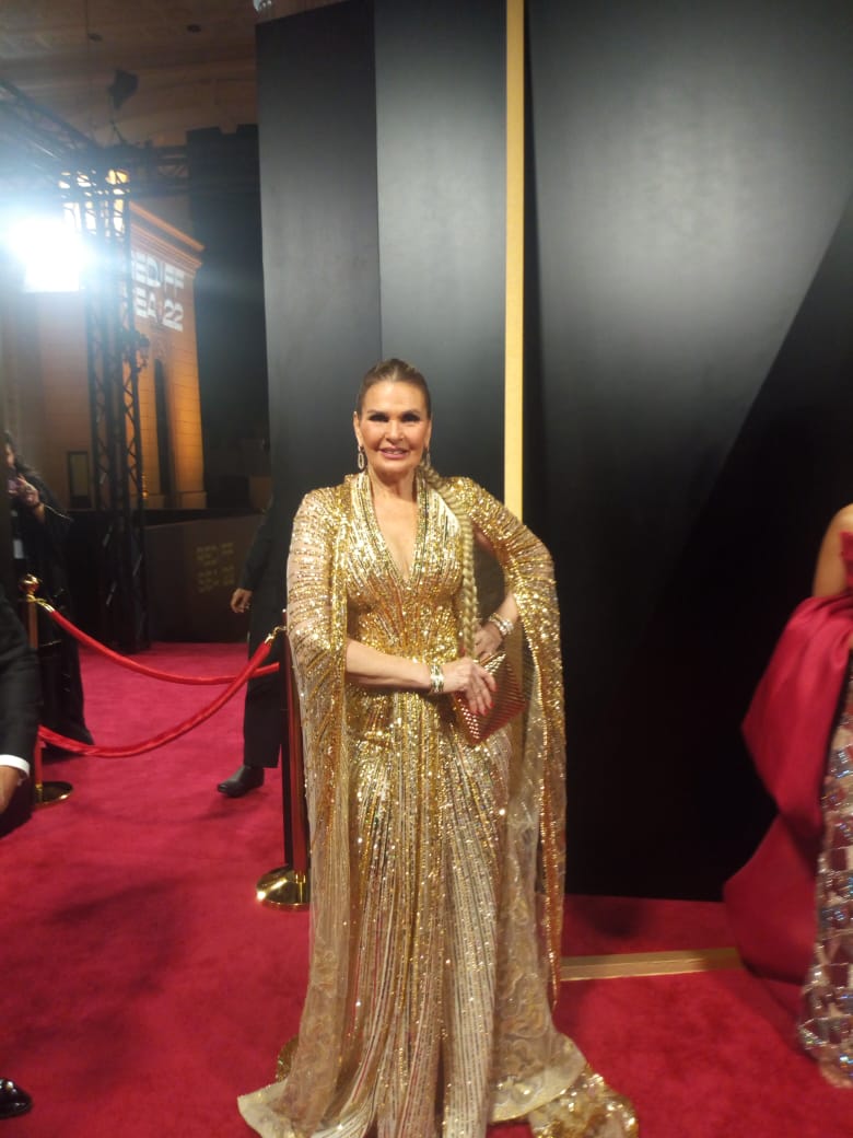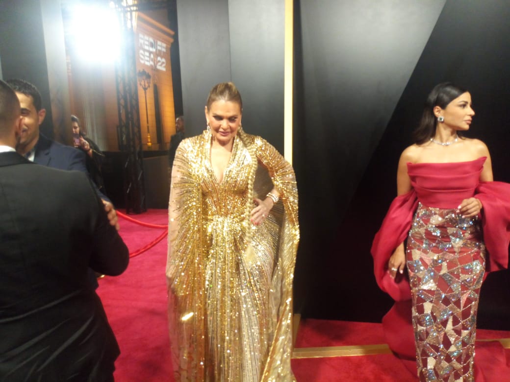 وظهرت الفنانة يسرا مرتدية فستان ملمع باللون الذهبي، بأكمام طويلة، وزينت الإطلالة بكلاتش بنفس اللون، ووضعت ميكاب بسيط ليتماشى مع الإطلالة.