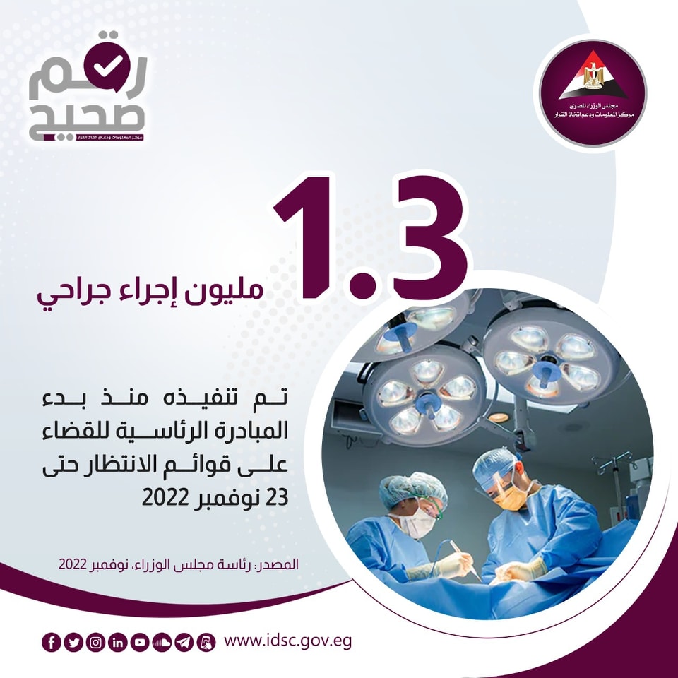 وأوضح أنه تم تنفيذ 1.3 مليون إجراء جراحي منذ إطلاق المبادرة حتى 23 نوفمبر 2022، وذلك في مختلف التخصصات مثل: قسطرة القلب، وجراحات القلب المفتوح، والمخ والأعصاب، والمفاصل، والرمد، والأورام، وزراعة الكبد، وزراعة الكلى، وزراعة القوقعة، والقسطرة المخية، والقسطرة الطرفية، ومن خلال أكثر من 480 مستشفى على مستوى الجمهورية.