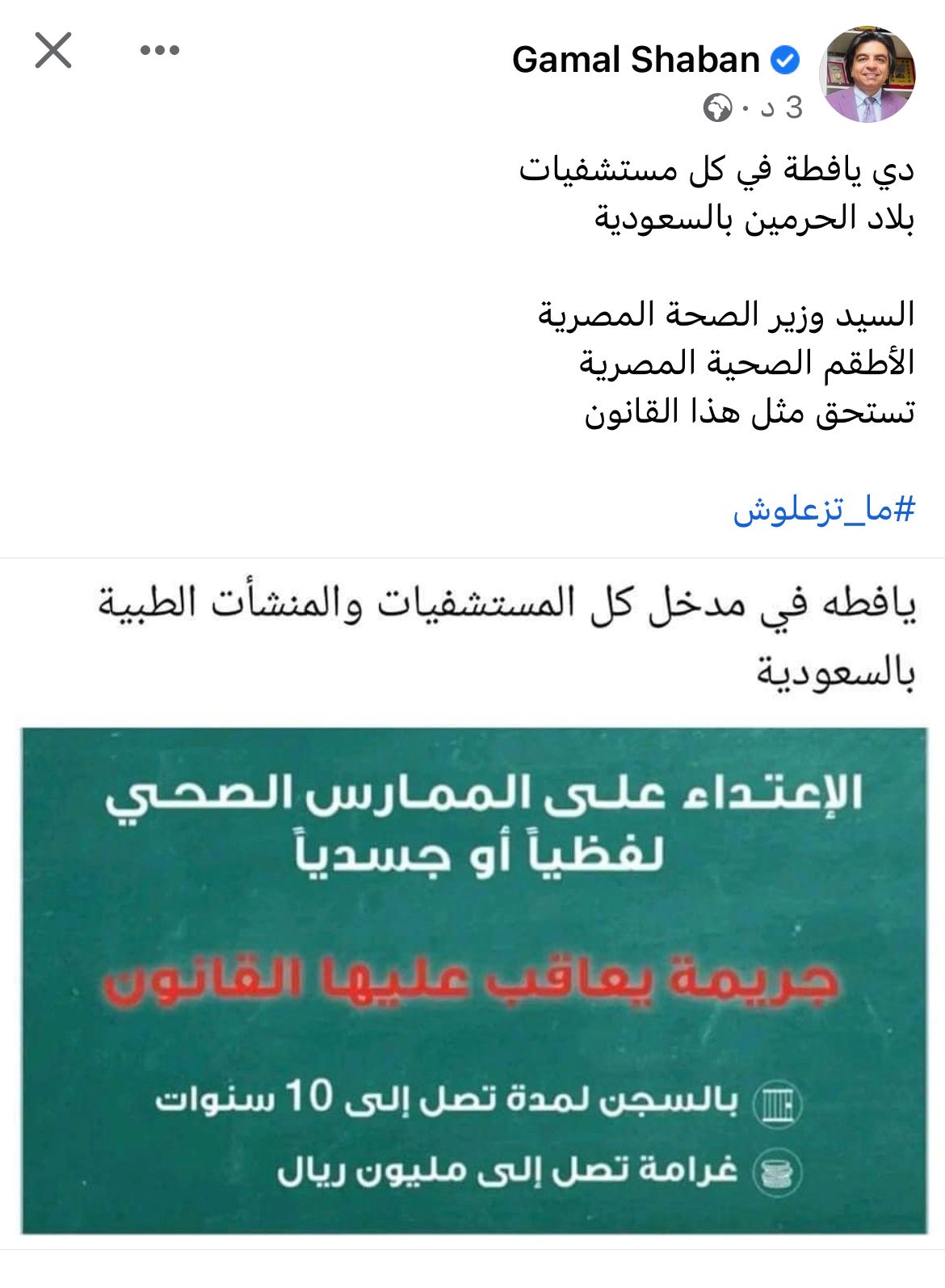 وأشار شعبان، عبر صفحته الرسمية بموقع التواصل الاجتماعي فيس بوك، قائلا:- يافطة في كل مستشفيات بلاد الحرمين بالسعودية السيد وزير الصحة المصرية، والأطقم الصحية المصرية تستحق مثل هذا القانون.