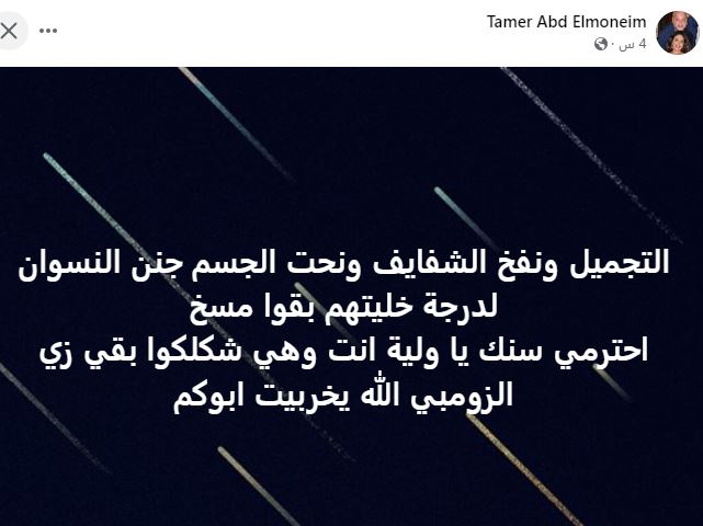 وكتب تامر عبد المنعم عبر حسابه الشخصي عبر موقع التواصل الإجتماعي "فيسبوك" قائلا: "التجميل ونفخ الشفايف ونحت الجسم، جنن النسوان، لدرجة خليتهم بقوا مسخ، احترمي سنك يا ولية أنت وهي، شكلكوا بقى زي الزومبي، الله يخربيت أبوكم".