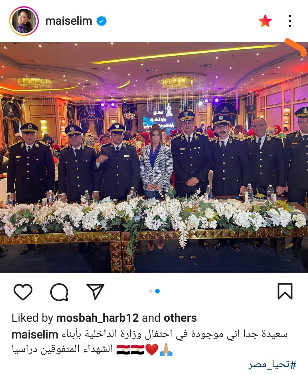 عبرت الفنانة مي سليم، عن سعادتها بعد حضورها إحتفالية وزارة الداخلية بأبناء الشهداء المتفوقين دراسيا، وذلك عبر صفحتها على موقع تبادل الصور والفيديوهات "إنستجرام".