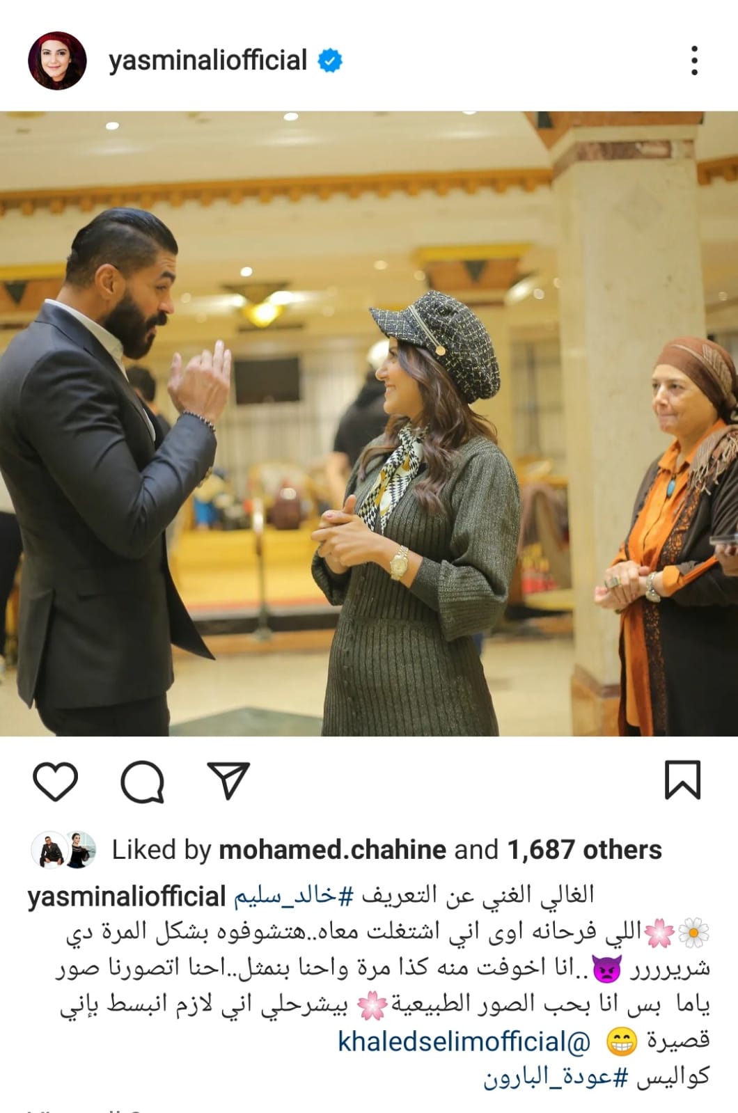 ونشرت ياسمين علي صورة تجمعها بـ خالد سليم، وعلقت عليها قائله: "الغالي الغني عن التعريف خالد سليم اللي فرحانه إني اشتغلت معاه، هتشوفوه بشكل المره دي شرير أنا خوفت منه كذا مره وإحنا بنصور، إحنا اتصورنا ياما بس أنا بحب الصور الطبيعية بيشرحلي بإني لازم انبسط إني قصيرة"