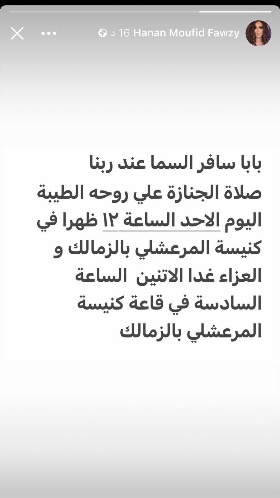 وكتبت حنان مفيد فوزي عبر حسابها الرسمي بموقع "إنستجرام"، "بابا سافر السما عند ربنا.. صلاة الجنازة على روحه الطيبة اليوم الأحد الساعة 12 ظهراً في كنيسة المرعشلي بالزمالك، والعزاء غداً الأثنين الساعة السادسة مساء في قاعة كنيسة المرعشلي بالزمالك".