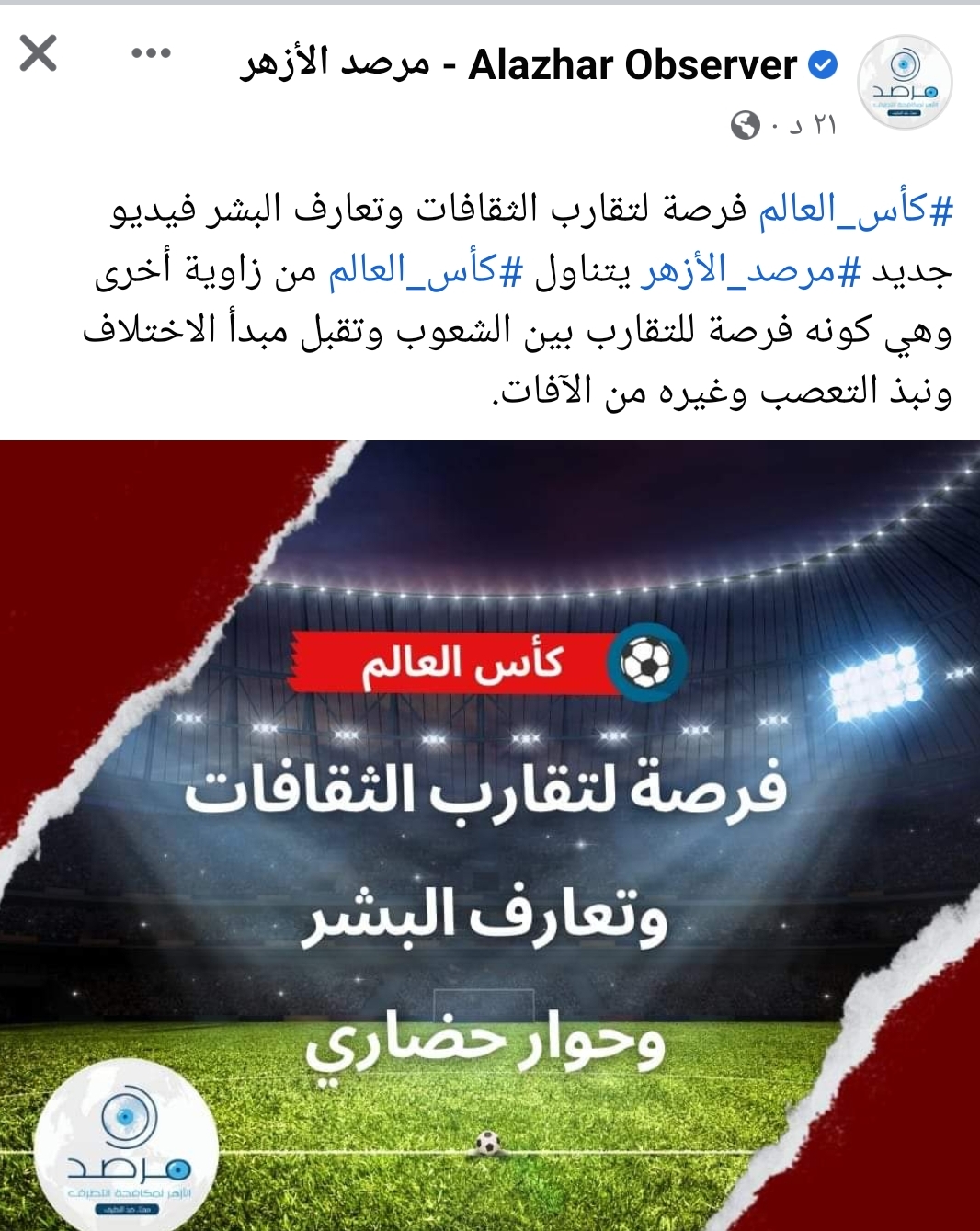 مرصد الأزهر: كأس العالم فرصة للتقارب بين الشعوب وتقبل مبدأ الاختلاف