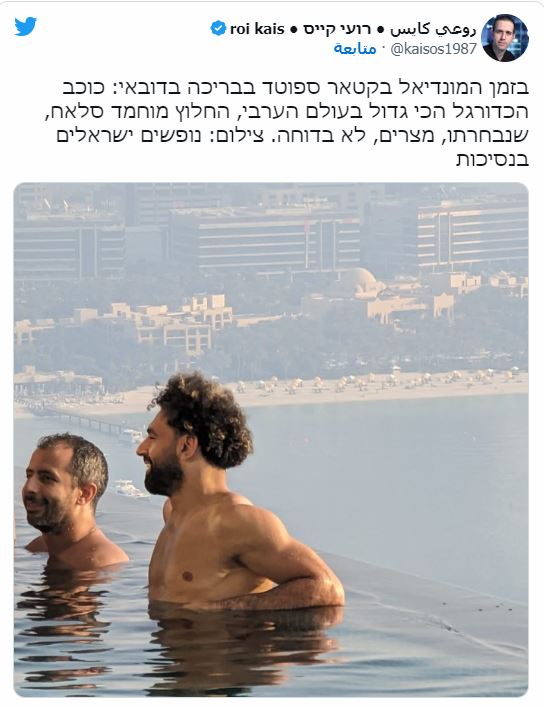 نشر مراسل الشؤون العربية في قناة "كان" الإسرائيلية، روعي كايس، صورة أثارت الجدل لنجم منتخب مصر ونادي ليفربول محمد صلاح، وهو يسبح في دبي على مسافة قريبة جدا من سائح إسرائيلي.