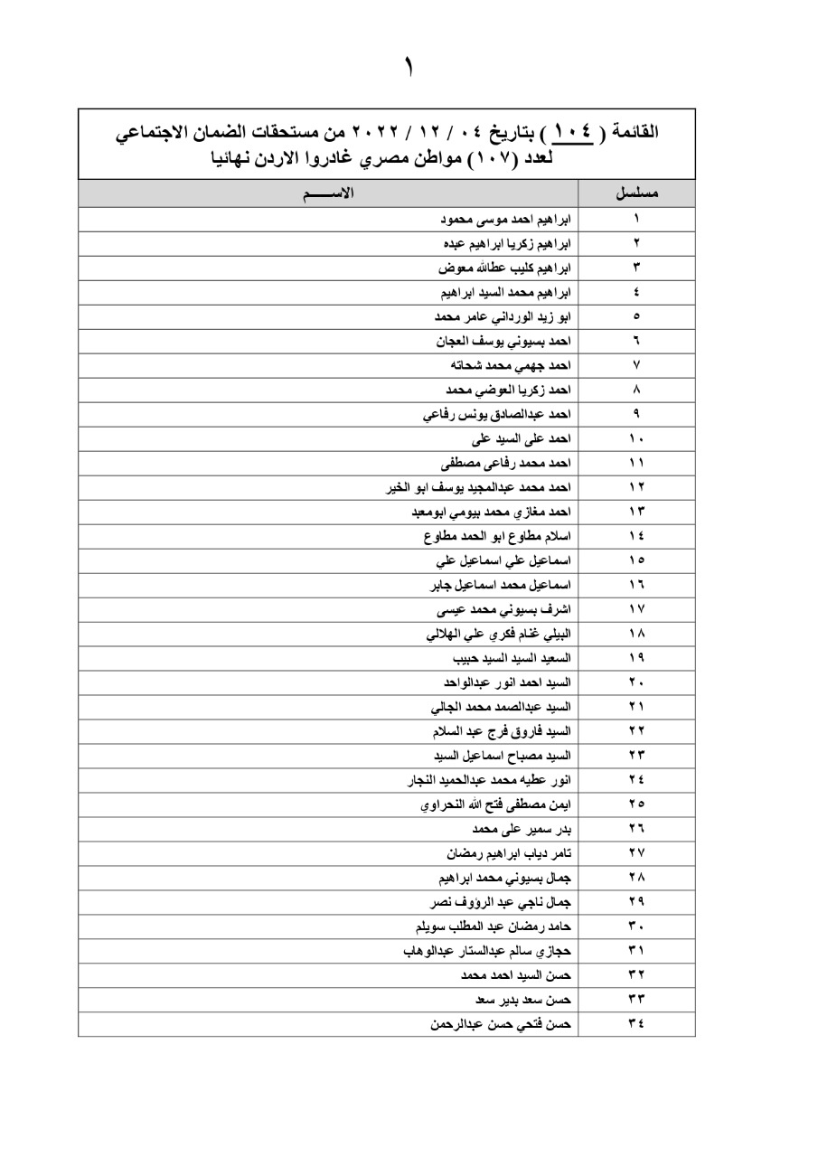 أعلنت وزارة القوى العاملة في بيان لها اليوم الأحد أن مكتب التمثيل العمالي التابع للوزارة بالسفارة المصرية بالعاصمة الأردنية عمان، تابع مع المسئولين بمؤسسة الضمان الاجتماعي بالأردن-استكمالا لما تم تحويله سابقاً عملية تحويل القائمة الـ 104 من مستحقات الضمان الاجتماعي لنحو 107 عامل مصري لدى" المؤسسة" غادروا عمان نهائيا.