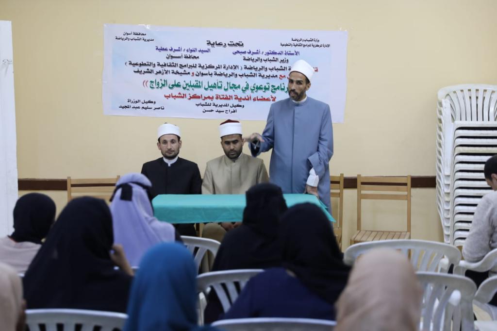 واصل مركز الأزهر العالمي للفتوى الإلكترونية، بالتعاون مع وزارة الشباب والرياضة، اليوم الأحد، فعاليات برنامجه "توعية وتأهيل المقبلين على الزواج"، المُقامة في محافظة أسوان، بعقد لقاء جماهيري مع الأهالي بمراكز الشباب في قرى العقاب وأبوالريش قبلي والحصايا التابعة لمركز أسوان.