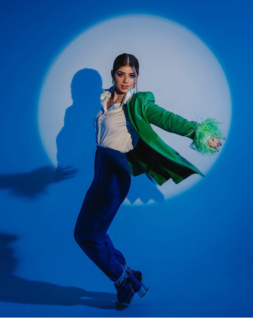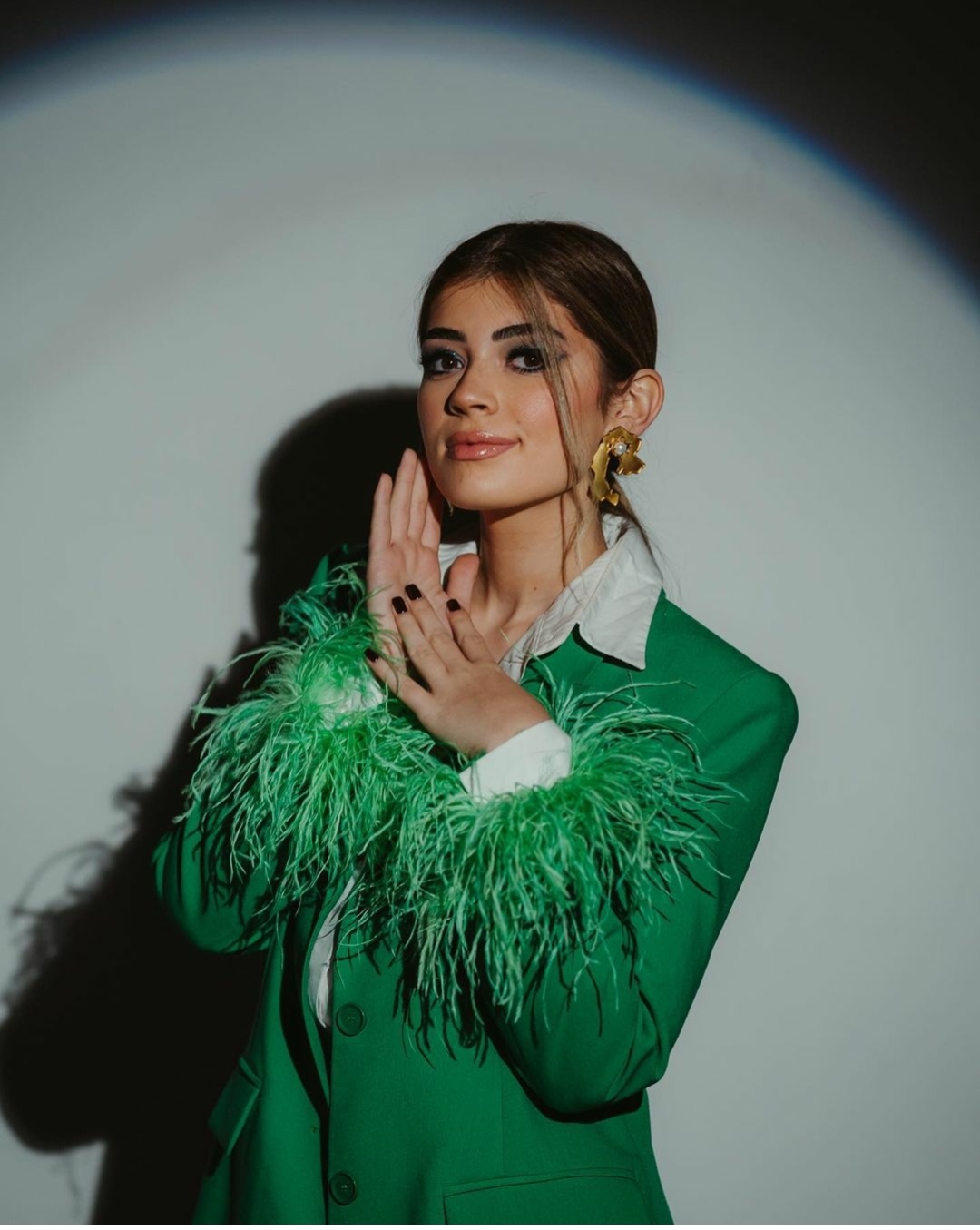 وظهرت ليلى زاهر وهي ترتدي بنطلون باللون الزهري، وتوب باللون الابيض وجاكيت باللون الأخضر ذات أكمام من الريش، وزينت الإطلالة بميكب بسيط ليتماشى مع اللوك.