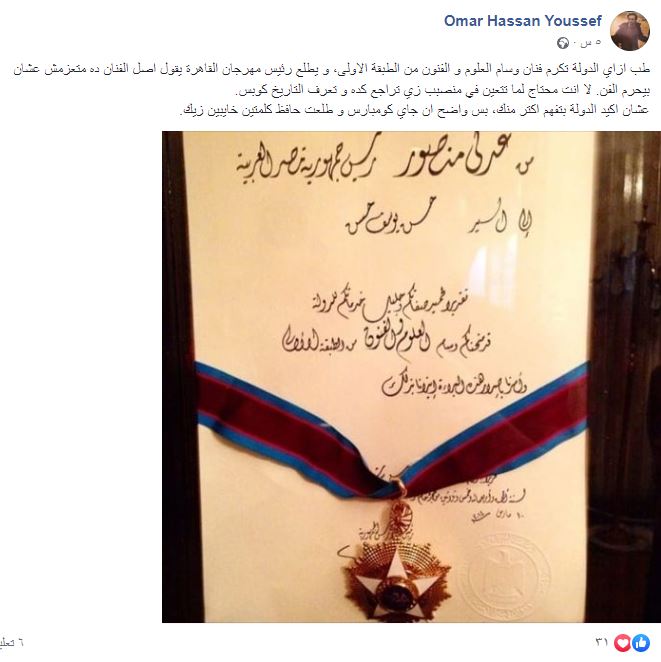 وقال عمر حسن يوسف عبر صفحته على موقع التواصل الإجتماعي "فيسبوك": "طب ازاي الدولة تكرم فنان وسام العلوم و الفنون من الطبقة الاولى، و يطلع رئيس مهرجان القاهرة يقول اصل الفنان ده متعزمش عشان بيحرم الفن.. لا انت محتاج لما تتعين في منصب زي تراجع كده وتعرف التاريخ كويس ، عشان أكيد الدولة بتفهم أكتر منك".