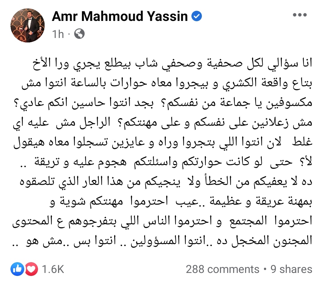 وتابع حديثه: "حتى لو كانت حوارتكم واسئلتكم هجوم عليه و تريقة ده لا يعفيكم من الخطأ ولا ينجيكم من هذا العار الذي تلصقوه بمهنة عريقة وعظيمة ..عيب احترموا مهنتكم شوية واحترموا المجتمع احترموا الناس اللي بتفرجوهم ع المحتوى المجنون المخجل ده ..انتوا المسؤولين .. انتوا بس ..مش هو".