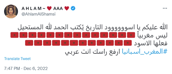 علقت الفنانة الإماراتية أحلام على فوز المنتخب المغربي الشقيق بعد فوزه على المنتخب الإسباني في دور الستة عشر لكأس العالم 2022 وصعوده لأول مرة لدور الثمانية.