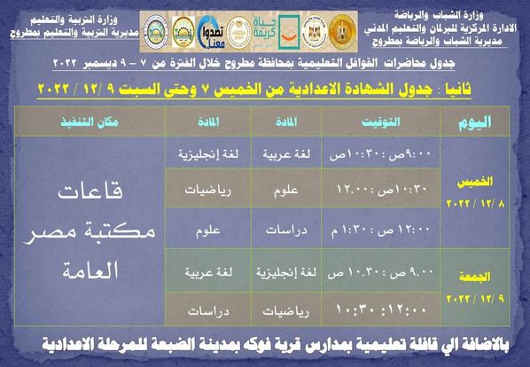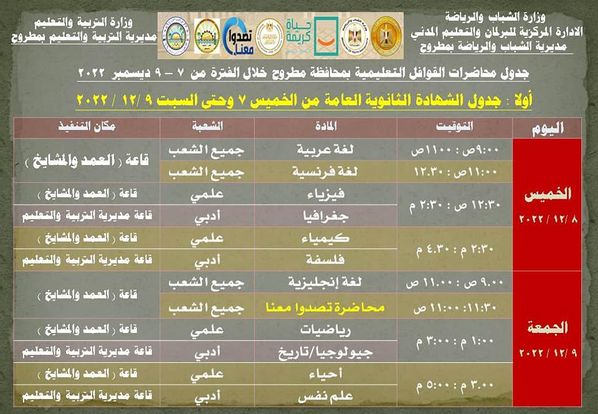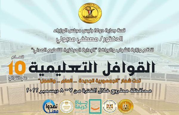 تُطلق وزارة الشباب والرياضة ، بقيادة الدكتور أشرف صبحي ، غدًا الخميس بمحافظة مطروح ، سادس محطات مشروع القوافل التعليمية والتنويرية لطلاب الشهادة العامة بالمرحلتين الثانوية والإعدادية للعام العاشر على التوالي، تحت شعار " الجمهورية الجديدة العلم والعمل" والذى تنفذه الوزارة بالتعاون مع وزارتي " التربية والتعليم والتعليم الفني ، التنمية المحلية ، وحدة تصدوا معنا "، بــ 16 محافظة ، وذلك ضمن خُطتها في المبادرة الرئاسية حياة كريمة للعام الدراسي 2022/2023 ، مساهمةً في النهوض بنظام التعليم الأساسي قبل الجامعى، وتخفيف العبء عن كاهل الأسرة المصرية من خلال مواجهة ظاهرة الدروس الخصوصية ، وكيفية مواجهة الشائعات والتصدي لها ، ذلك تحت رعاية الدكتور مصطفي مدبولي - رئيس مجلس الوزراء.