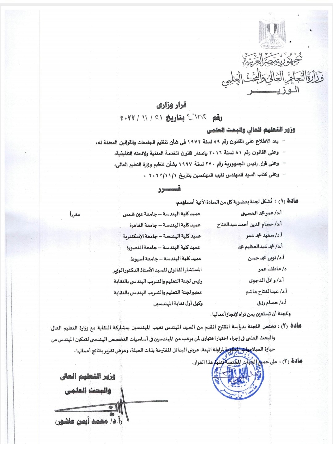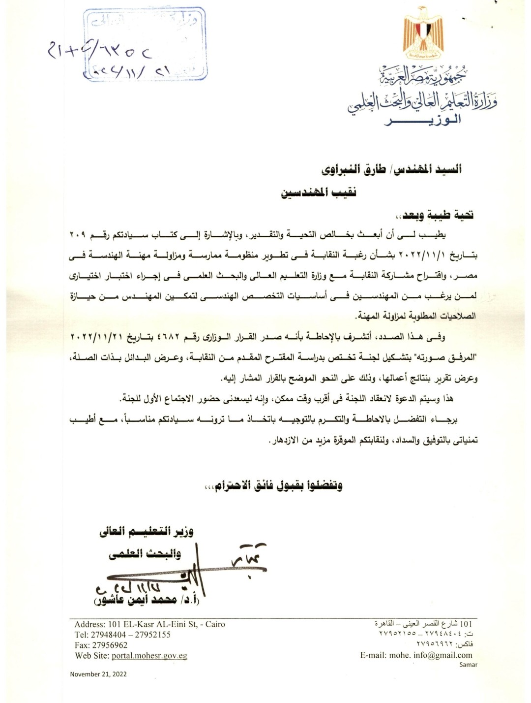 وأصدر وزير التعليم العالي قرارا وزاريا حمل رقم -4682 - بتاريخ 21/11/2022، بتشكيل لجنة تختص بدراسة المقترح المقدم من نقيب المهندسين، وعرض البدائل بذات الصلة، وعرض تقرير بنتائجها، وسيتم دعوة اللجنة للانعقاد في أقرب وقت ممكن، بحضور نقيب المهندسين طارق النبراوي، ووزير التعليم العالي والبحث العلمي أيمن عاشور.