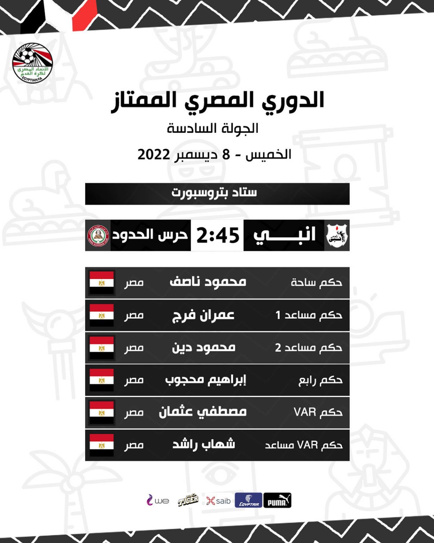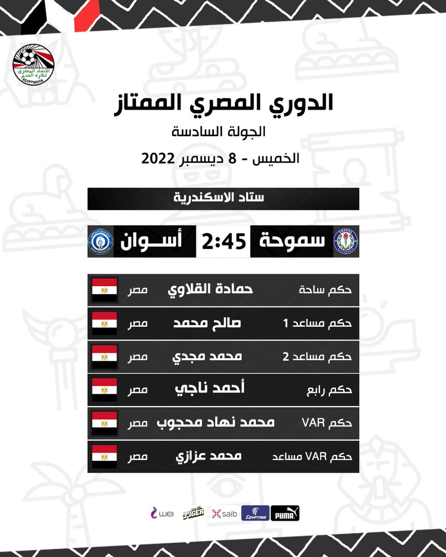كشفت لجنة الحكام بالاتحاد المصري لكرة القدم، عن حكام مباريات الجولة السادسة من الدوري المصري الممتاز المقرر إقامتها غدًا الخميس.