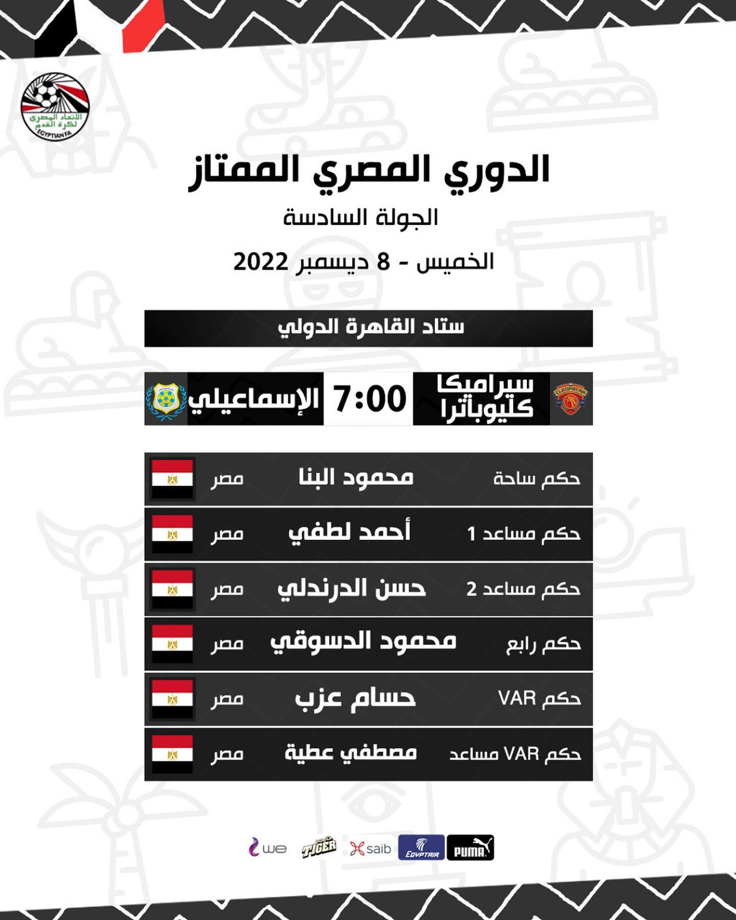 ويقود الحكم الدولي محمود البنا مباراة الإسماعيلي وسيراميكا كليوباترا ضمن الجولة السادسة من مسابقة الدوري.