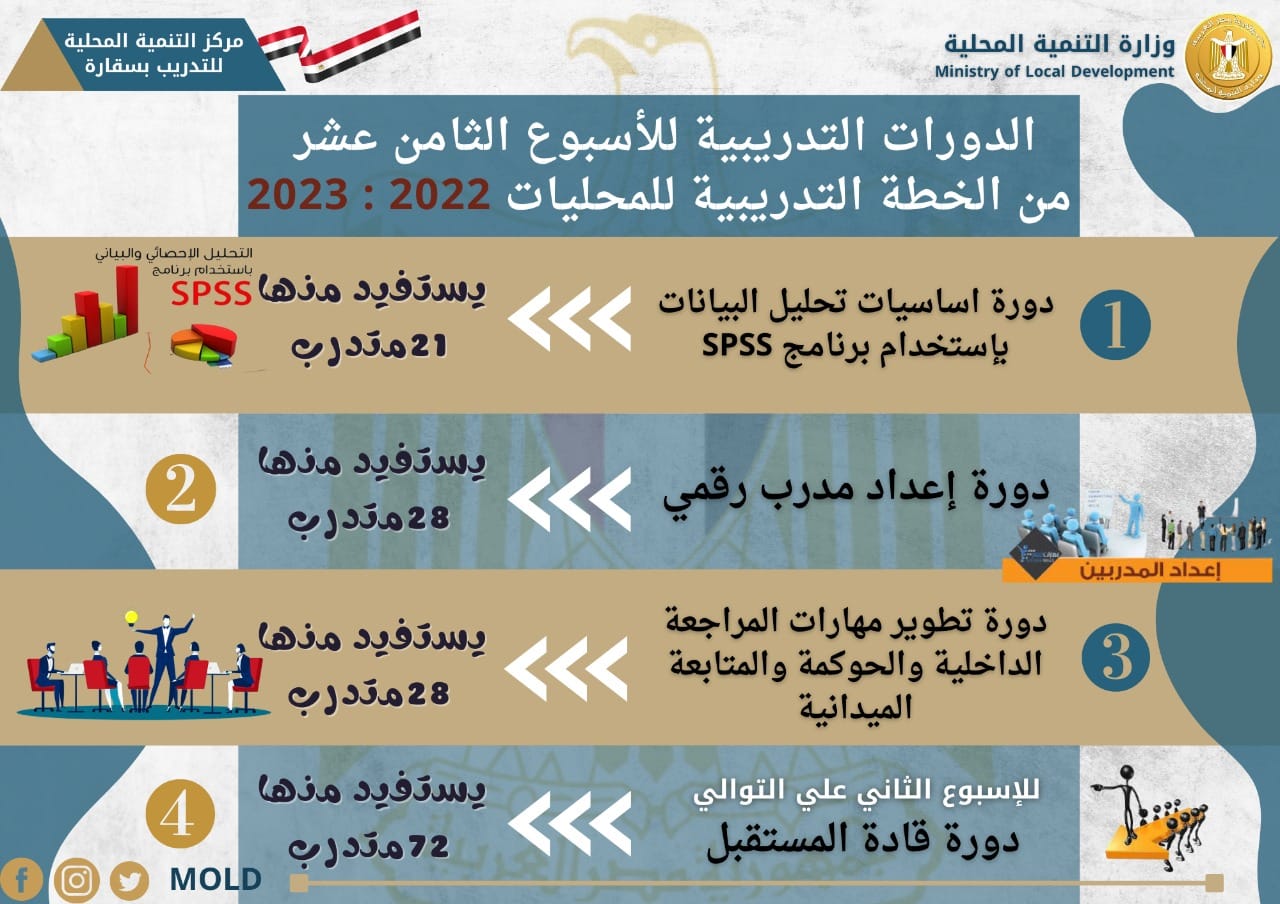 ولفت اللواء هشام آمنة أن سيتم خلال الاسبوع المقبل تنظيم دورة ثالثة عن دورة اساسيات تحليل البيانات باستخدام برنامج SPSS – يستفيد منها 21 متدرب ، وتتضمن استراتيجية تحليل البيانات والتعرف على قوائم البرنامج ، وادخال البيانات على البرنامج ، والتحقق من الادخال ومواصفات التغيير ومعالجة البيانات وتخزينها ، وتحديد هدف الدراسة واستخراج الجداول ومخرجات المتغيرات ، مشيراً الى استمرار دورة إعداد قادة المستقبل خلال الاسبوع الـ18 للاسبوع الثانى على التوالى ، و يستفيد منها 72 متدرب .