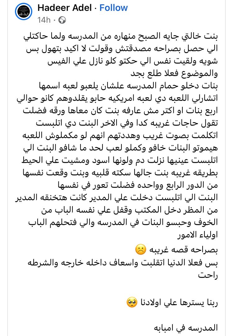وتابعت " البنت اللى اتلبست دخلت علي المدير كانت هتخنقه المدير من المظر دخل المكتب وقفل علي نفسه الباب من الخوف وحبسوا البنات في المدرسة والذي فتح لهم الباب أولياء الأمور بصراحة قصة غريبة بس فعلا الدنيا اتقلبت واسعاف داخله خارجه والشرطة راحت".
