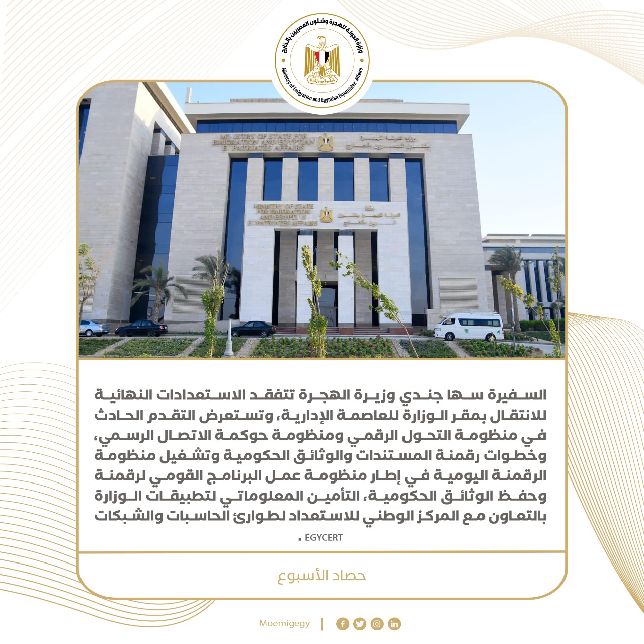 5- السفيرة سها جندي وزيرة الهجرة تتفقد الاستعدادات النهائية للانتقال بمقر الوزارة للعاصمة الإدارية، وتستعرض التقدم الحادث في منظومة التحول الرقمي ومنظومة حوكمة الاتصال الرسمي، وخطوات رقمنة المستندات والوثائق الحكومية وتشغيل منظومة الرقمنة اليومية في إطار منظومة عمل البرنامج القومي لرقمنة وحفظ الوثائق الحكومية، التأمين المعلوماتي لتطبيقات الوزارة بالتعاون مع المركز الوطني للاستعداد لطوارئ الحاسبات والشبكات EGYCERT .