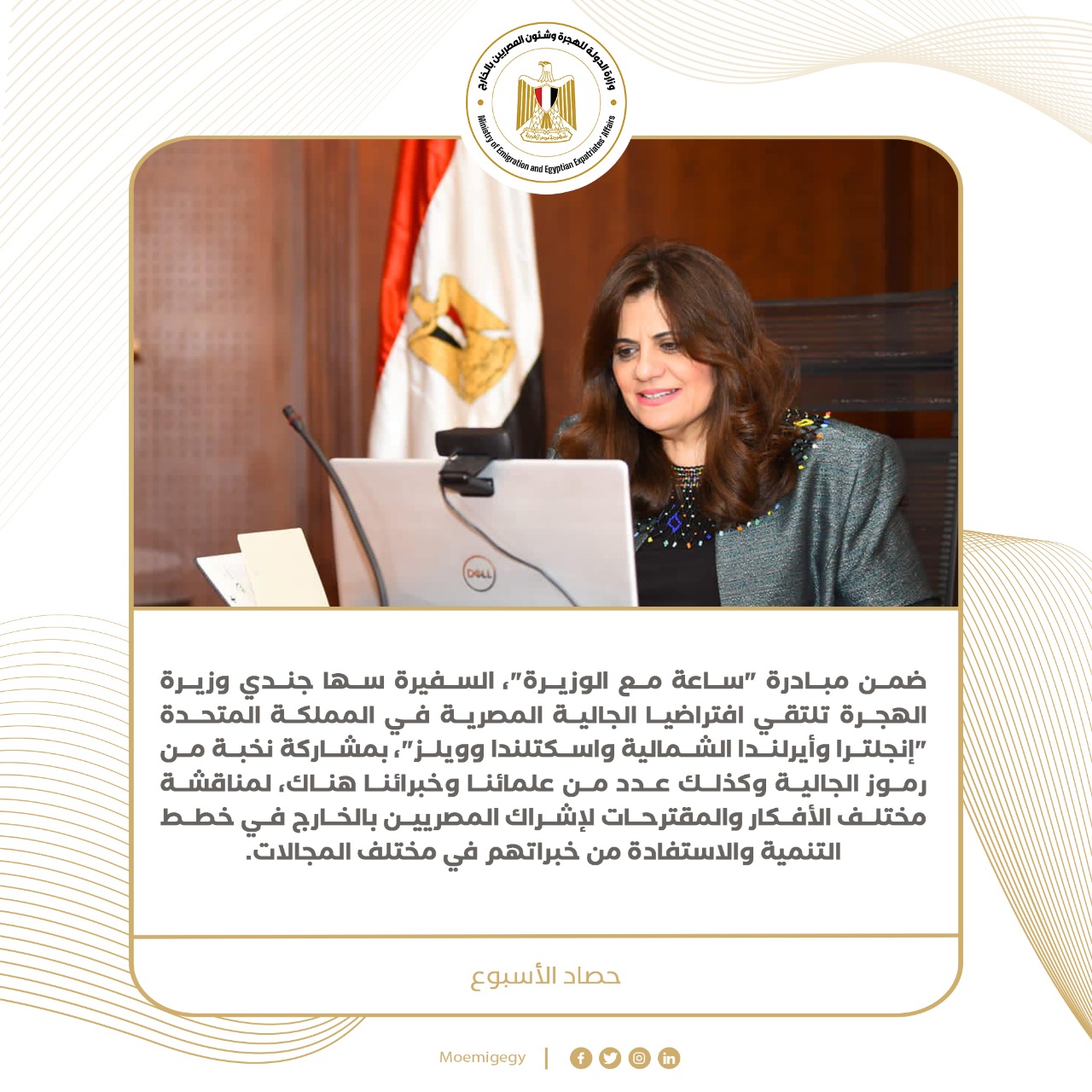 4- ضمن مبادرة "ساعة مع الوزيرة"، السفيرة سها جندي وزيرة الهجرة تلتقي افتراضيا الجالية المصرية في المملكة المتحدة "إنجلترا وأيرلندا الشمالية واسكتلندا وويلز"، بمشاركة نخبة من رموز الجالية وكذلك عدد من علمائنا وخبرائنا هناك، لمناقشة مختلف الأفكار والمقترحات لإشراك المصريين بالخارج في خطط التنمية والاستفادة من خبراتهم في مختلف المجالات.
