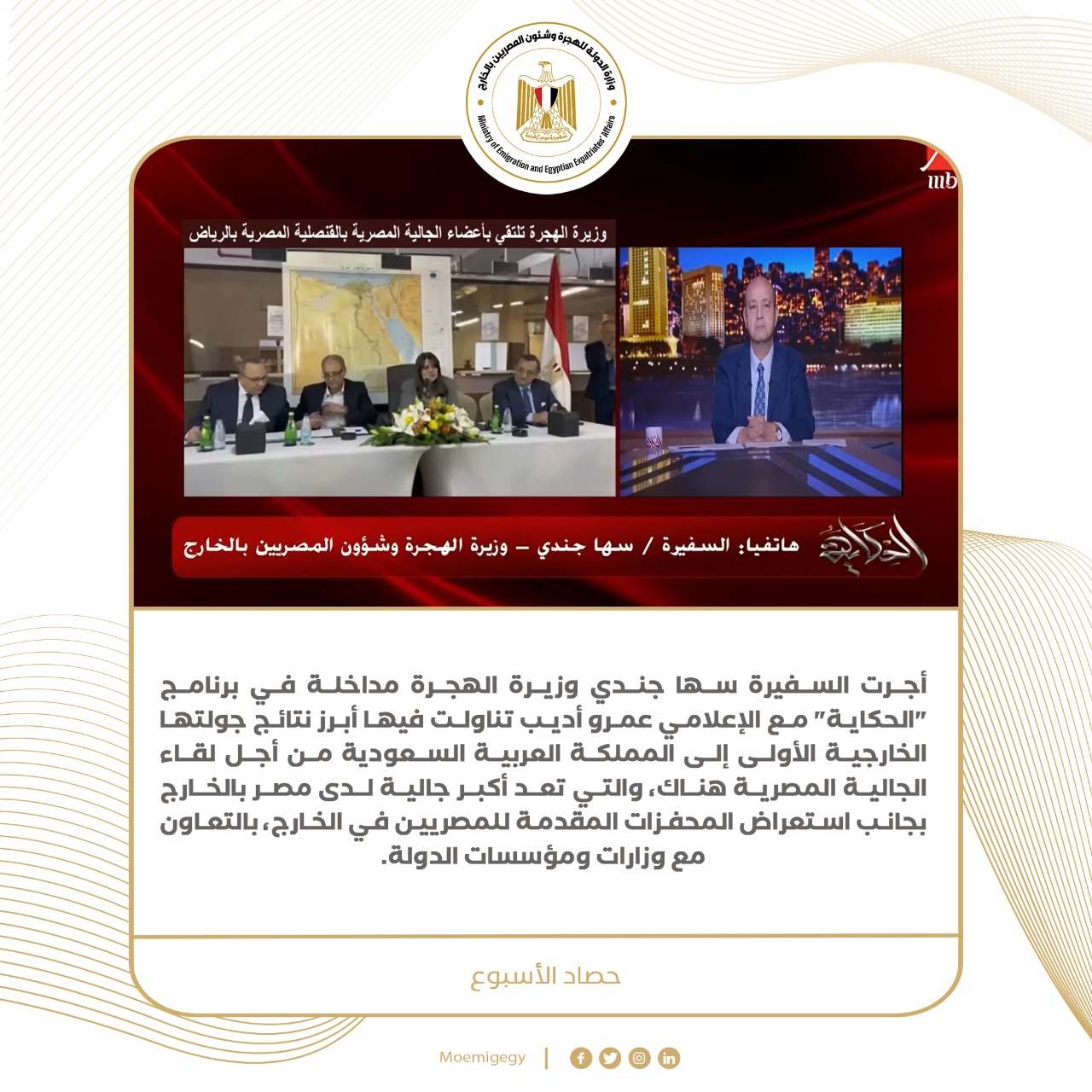 6- أجرت السفيرة سها جندي وزيرة الهجرة مداخلة في برنامج "الحكاية" مع الإعلامي عمرو أديب تناولت فيها أبرز نتائج جولتها الخارجية الأولى إلى المملكة العربية السعودية من أجل لقاء الجالية المصرية هناك، والتي تعد أكبر جالية لدى مصر بالخارج بجانب استعراض المحفزات المقدمة للمصريين في الخارج، بالتعاون مع وزارات ومؤسسات الدولة.