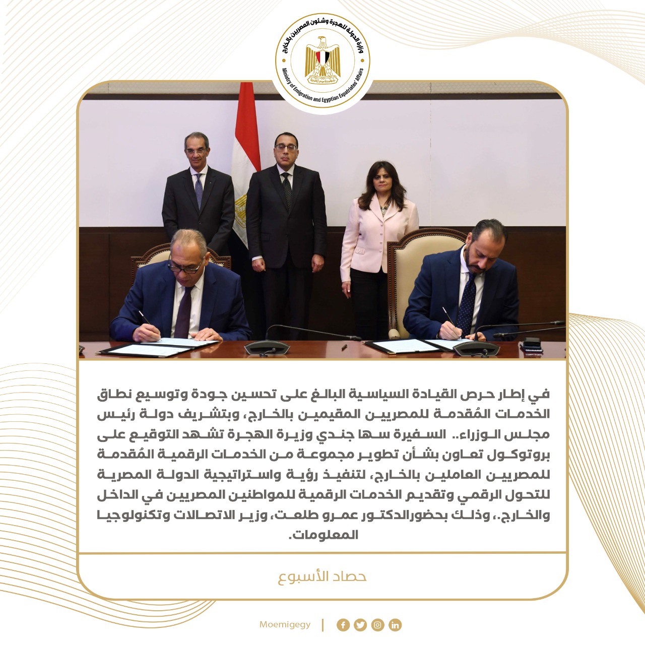 1- في إطار حرص القيادة السياسية البالغ على تحسين جودة وتوسيع نطاق الخدمات المُقدمة للمصريين المقيمين بالخارج، وبتشريف دولة رئيس مجلس الوزراء، السفيرة سها جندي وزيرة الهجرة تشهد التوقيع على بروتوكول تعاون بشأن تطوير مجموعة من الخدمات الرقمية المُقدمة للمصريين العاملين بالخارج، لتنفيذ رؤية واستراتيجية الدولة المصرية للتحول الرقمي وتقديم الخدمات الرقمية للمواطنين المصريين في الداخل والخارج، وذلك بحضورالدكتور عمرو طلعت، وزير الاتصالات وتكنولوجيا المعلومات.