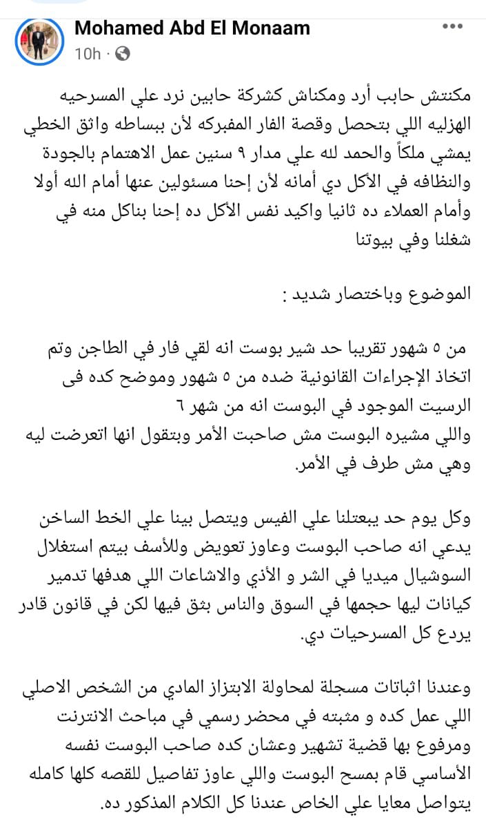 وأشار إلى أن، الموضوع وباختصار شديد، من 5 شهور تقريبا، حد شير بوست إنه لقي فأر في الطاجن، وتم اتخاذ الإجراءات القانونية ضده من 5 شهور وموضح كده فى الرسيت الموجود في البوست أنه من شهر 6، مضيفا اللي مشير البوست مش صاحبة الأمر، وبتقول إنها اتعرضت ليه وهي مش طرف في الأمر.