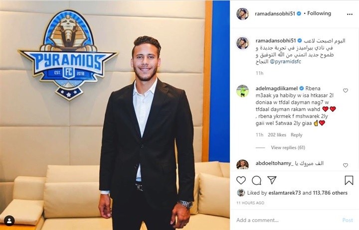 وعلق اللاعب رمضان صبحى قائلاً :" اليوم اصبحت لاعب فى نادى بيراميدز فى تجربة جديدة وطموح اتمني من الله التوفيق والنجاح " ، وانهالت التعليقات من المتابعين والاصدقاء ، حيث علق عادل مجدى كمال :" ربنا معاك يا حبيبي وهتكسرالدنيا وتفضال دايماً ناجح وتفضل دايماً رقم واحد ، ربنا يكرمك فى مشوارك اللى جاى خطوة بخطوة .