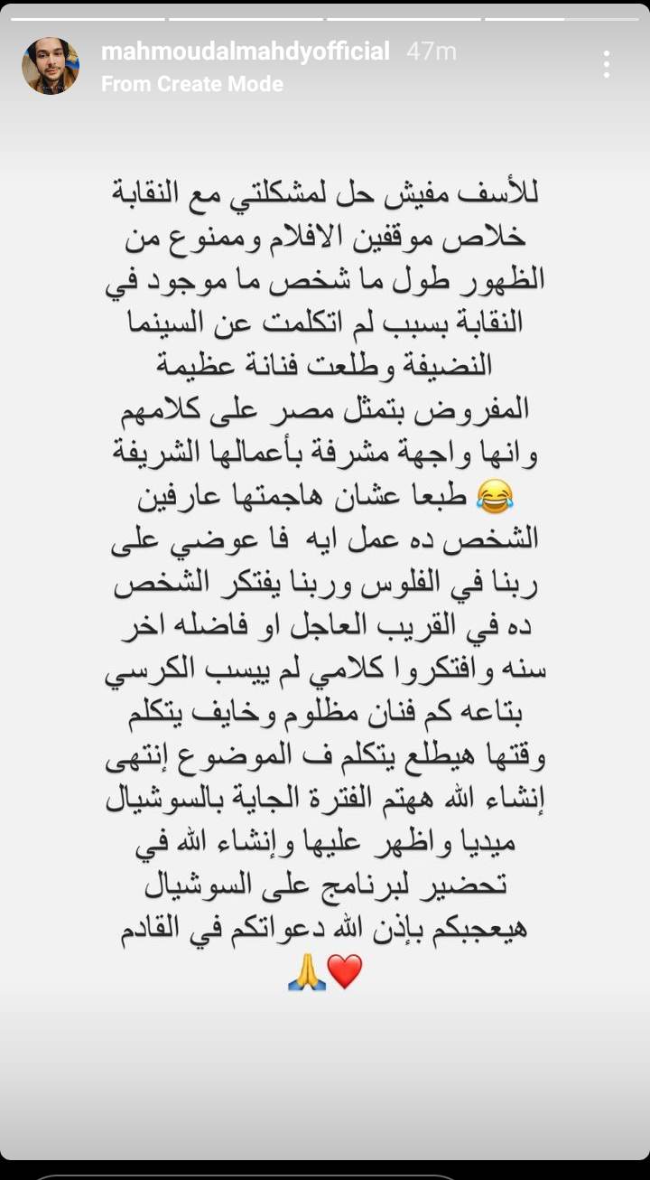 وكتب محمود المهدي عبر حسابه الرسمي بموقع تبادل الصور والفيديوهات “انستجرام” من خلال خاصية “ستوري”قائلا:" للاسف مفيش حل لمشكلتي مع النقابة خلاص موقفين الأفلام وممنوع من الظهور طول ما فيه شخص معين موجود في النقابة، بسبب اني اتكلمت عن السينما النضيفة وطلعت فنانة عظيمة المفروض بتمثل مصر على كلامهم وإنها وجهة مشرفة بأعمالها الشريفة".