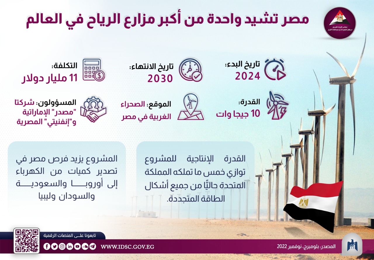 نشر مركز المعلومات ودعم اتخاذ القرار بمجلس الوزراء المصري إنفوجرافيك جديدًا يتضمن أبرز المعلومات حول تشييد مصر واحدة من أكبر مزارع الرياح في العالم وفق أحد الاتفاقيات التي أبرمتها مصر متمثلة في شركة إنفينتي مع شركة مصدر الإمارتية خلال فعاليات قمة المناخ COP27.