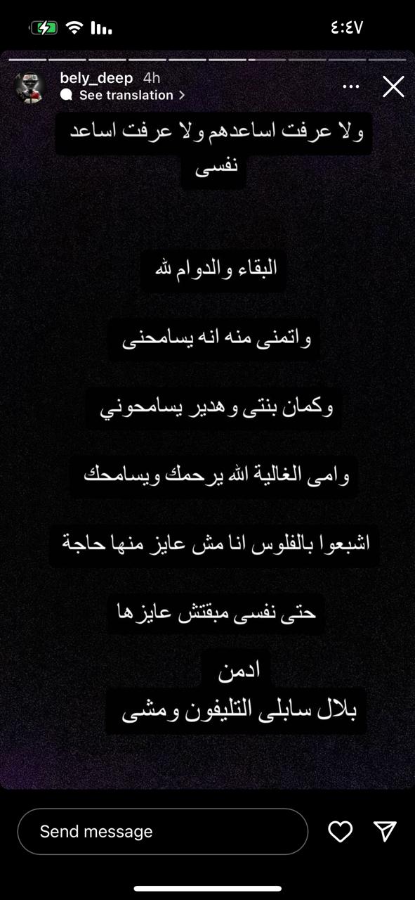 وقال بلال طليق البلوجر هدير عاطف: “الحقوا هدير وكايلا بنتي وذنبي في رقبتكوا ، دي فلوسي وشقا عمري وحق بنتي ، ولا عرفت أساعدهم ولا أساعد نفسي ، اشبعوا بالفلوس وأنا مش عايز منها حاجة، حتى نفسي مش عاوزها لو فيه أدمن بينزل الاستوري يبقى الفلوس في أمان بس بلال مش في أمان أو مات أو في المستشفى ”.