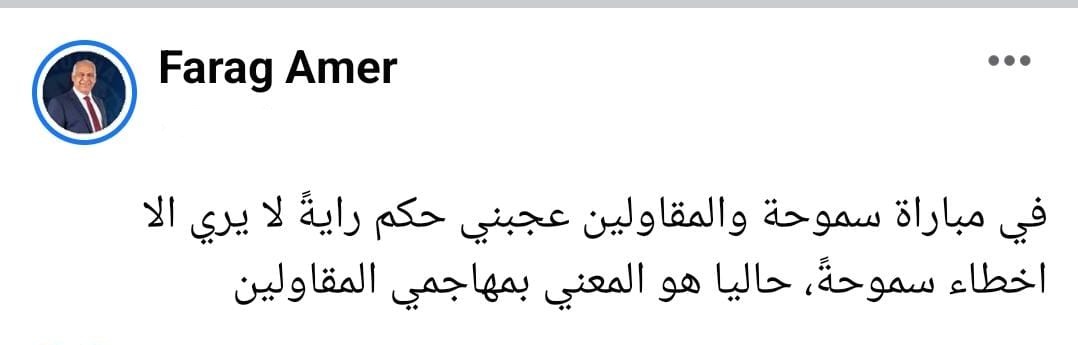 وكتب عامر، رئيس نادى سموحة، عبر حسابه على "فيسبوك": "في مباراة سموحة والمقاولون عجبني حكم راية لا يرى إلا أخطاء سموحة، حاليا هو المعني بمهاجمي المقاولون".