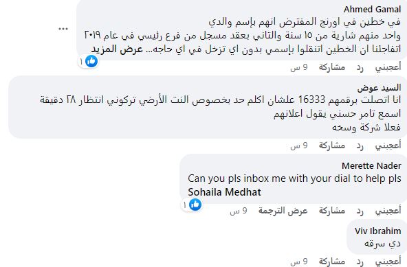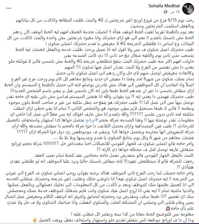 وتابعت عن مشكلتها مع شركة أورانج "فضلت معاهم من شهر 6 وكل يوم بنتابع الشكوي يا فندم وبندرسها وبلا بلا بلا ….واخر حاجه قالو اعملي شكوي ف للجهاز القومي للاتصالات احنا معندناش حل ؟؟!!!!!!!!! شركه بحجم اورانج متبقاش عارفه توصل لحل ف مشكله جواها دي كارثه ؟؟