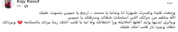 كشفت نورا زوجة محمد سليمان ، صاحب الهاشتاج الأكثر تداولا على السوشيال ميديا "اختفاء محمد سليمان" بعد اتهام أهله لزوجته بالتسبب فى اختفائه تفاصيل الواقعة قائلة " اتجوز عليا وخلى زوجته الثانية تشهر بيا .. محمد مطلقني 3 مرات ومتحرمة عليه.. ورافعة عليه قضية خلع".