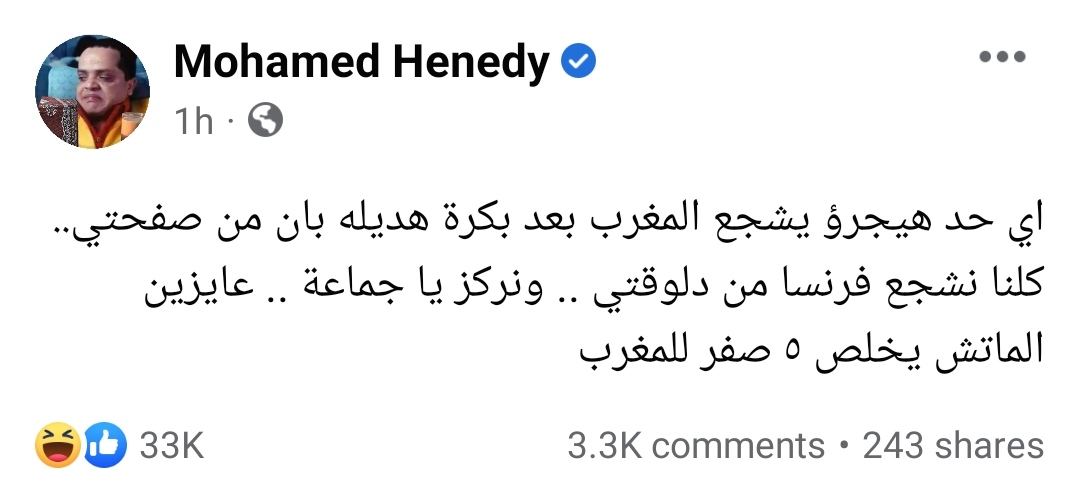 وكتب محمد هنيدي عبر حسابه الشخصي على موقع التواصل الاجتماعي " الفيسبوك": "أي حد هيجرؤ يشجع المغرب بعد بكرة هديله بان من صفحتي.. كلنا نشجع فرنسا من دلوقتي.. ونركز يا جماعة.. عايزين الماتش يخلص ٥ صفر للمغرب".