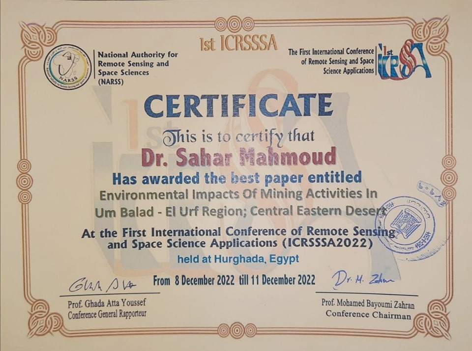وقد حصلت الدكتورة سحر محمود عبد الباقى أحمد مدرس الجيولوجيا بقسم العلوم البيولوجية والجيولوجيا بكليه التربية جامعه عين شمس على جائزة أفضل بحث بعنوان "التأثيرات البيئية لأنشطة التعدين في منطقة أم بلد العرف وسط الصحراء الشرقية" وتم تكريمها من الدكتور محمد بيومي زهران رئيس الهيئة القومية للاستشعار من البعد وعلوم الفضاء ورئيس المؤتمر والدكتورة غاده عطا نائب رئيس الهيئة القومية للاستشعار من البعد وعلوم الفضاء لشئون ريادة الأعمال وخدمة المجتمع ومقرر المؤتمر.