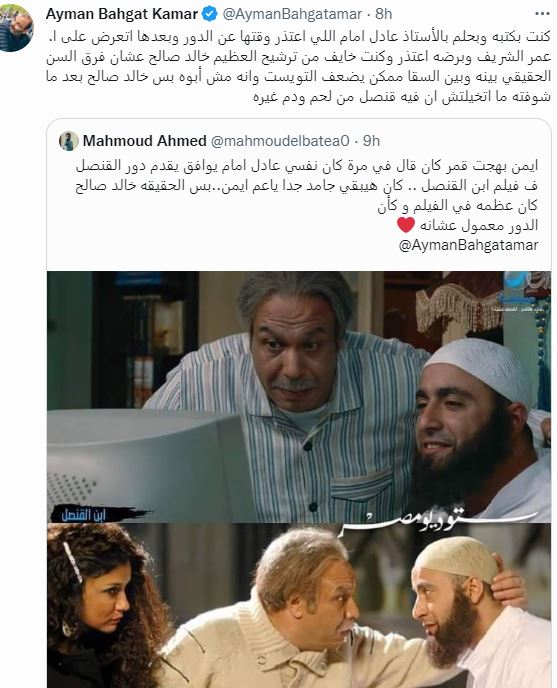 وكتب أيمن بهجت قمر، عبرموقع التدوينات القصيرة “تويتر” مغردا:"كنت بكتب فيلم ابن القنصل، وبحلم بالأستاذ عادل إمام اللي اعتذر وقتها عن الدور، وبعدها اتعرض على أستاذ عمر الشريف وبرضه اعتذر".
