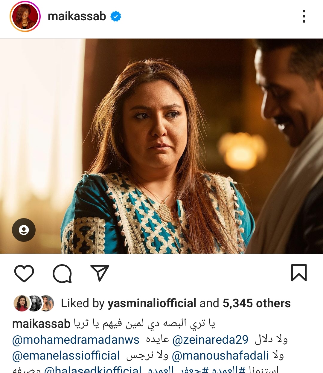 وكتبت مى كساب على تلك الصورة قائلة: "يا ترى البصة دي لمين فيهم جعفر العمدة - محمد رمضان، ولا عايدة - زينة، ولا دلال- إيمان العاصي، ولا نرجس - منة فضالي، ولا وصيفة - هالة صدقي.. استنونا.. العمدة".