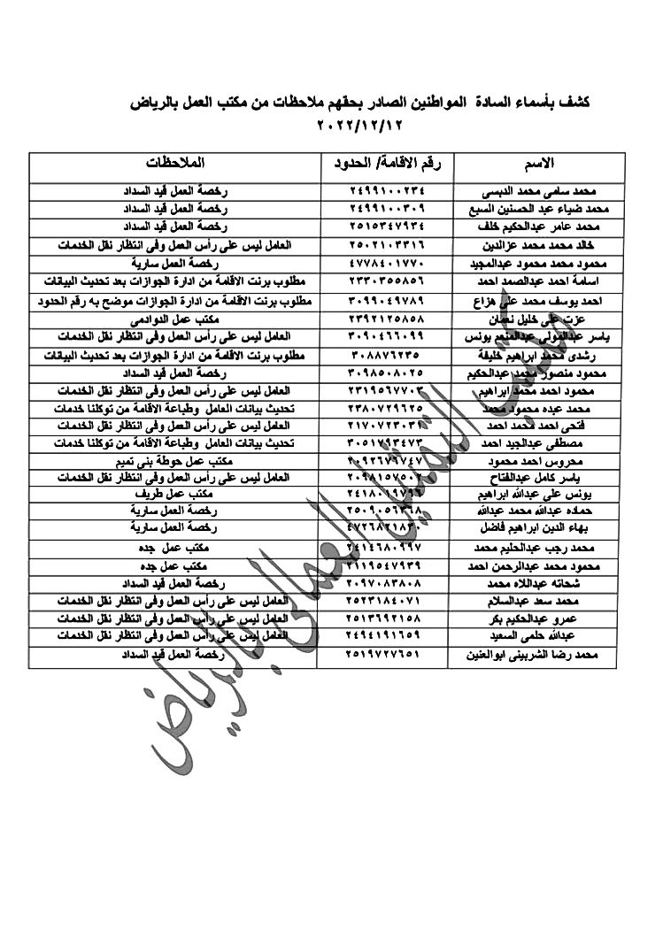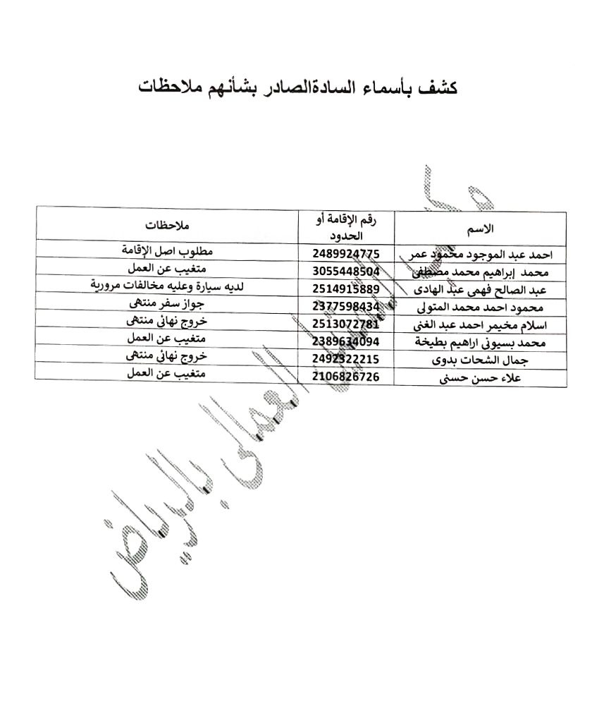 وجاء في التقرير الذي تلقاه وزير القوى العاملة حسن شحاتة ،من أحمد رجائي المستشار العمالي بسفارة جمهورية مصر العربية بالرياض، أن القائمة تضم: 49 تأشيرة خروج نهائي وإبعاد لمن لديهم الرغبة في العودة إلى مصر ، ممن انتهت اقامتهم ولم يقوم صاحب العمل بالتجديد لهم ، وتأشيرة خروج نهائى تهرب عن العمل ولا يمكنه العودة للسعودية مرة أخرى الا بعد مرور 5 سنوات، و 27 من العاملين الذين تعذر إتمام تأشيرة الخروج النهائي لهم نظراً لوجود ملاحظات تمنعهم من السفر ، وجاء في القائمة أيضا عدد 8 طلبات من إدارة الوافدين بالرياض رغم موافقة مكتب العمل على الخروج النهائي نظراً لوجود ملاحظات تمنعهم من السفر.