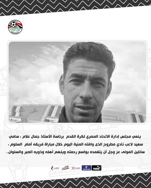 نعي مجلس إدارة الاتحاد المصري لكرة القدم برئاسة جمال علام، سامي سعيد لاعب نادي مطروح الذى وافته المنية اليوم خلال مباراة فريقه أمام السلوم، سائلين المولى عز وجل أن يتغمده بواسع رحمته ويلهم أهله وذويه الصبر والسلوان.