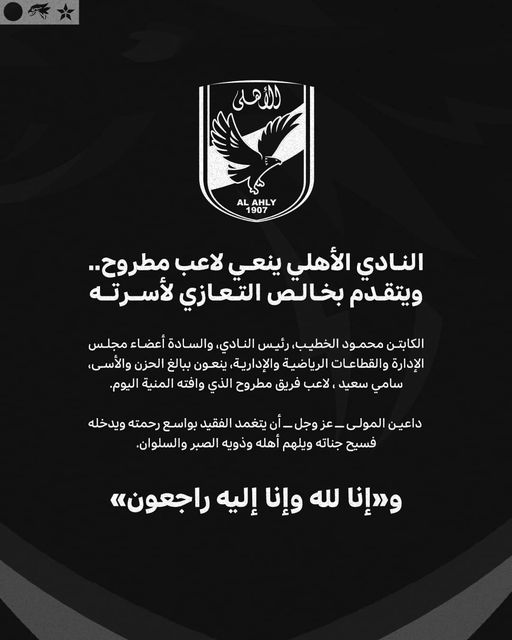 الأهلي ينعى لاعب مطروح ويتقدم بخالص التعازي لأسرته